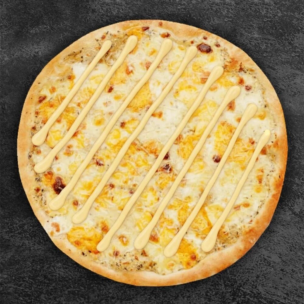Состав: Тесто, соус томатный, сыр моцарелла, курица, соус сырный.