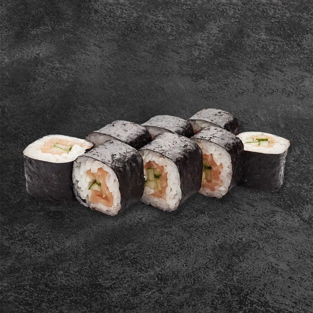 Состав: рис, нори, лосось, огурец. В комплекте: имбирь-1 шт, васаби-1 шт, соевый соус-1 шт.