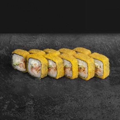 Состав: рис, нори, сыр творожный, угорь, лосось, имбирь, кунжут, огурец, соус спайси. В комплекте: имбирь-1 шт, васаби-1 шт, соевый соус-1 шт.