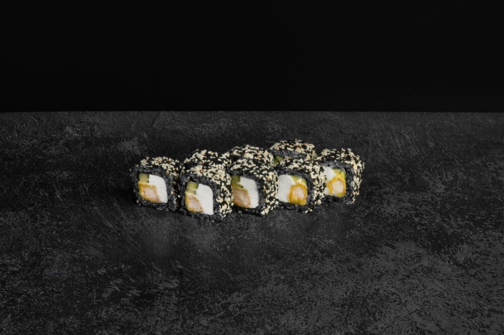 Состав: Рис черный, нори, креветки в кляре, сыр творожный, огурец, кунжут, соус спайси. В комплекте: имбирь-1 шт, васаби-1 шт, соевый соус-1 шт.
