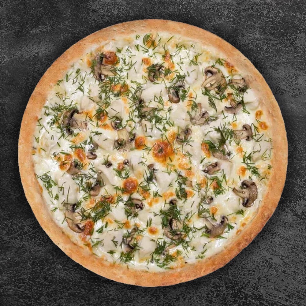 Состав: Тесто, соус сливочный, сыр моцарелла, курица, шампиньоны, укроп.