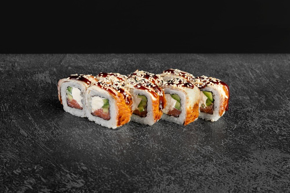 Состав: Рис, нори, угорь, лосось, творожный сыр, унаги соус, кунжут. В комплекте: имбирь-1 шт, васаби-1шт, соевый соус-1 шт.