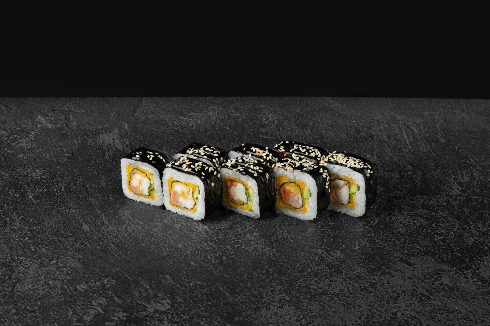 Состав: нори, рис, майонез, тунец, окунь, креветки, лосось, огурец, соус унаги, кунжут. В комплекте: имбирь 1 - шт., васаби - 1 шт., соевый соус 1 - шт.