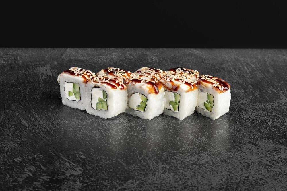 Состав: рис, нори, огурец, сыр творожный, угорь, соус унаги, кунжут. В комплекте: имбирь - 1 шт., васаби - 1 шт., соевый соус - 1 шт.