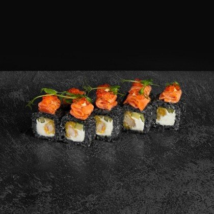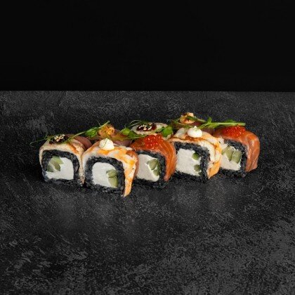 Состав: Рис черный, нори, сыр творожный, томаго, лосось, икра масаго, спайси соус. В комплекте: имбирь-1 шт, васаби-1шт, соевый соус-1 шт.