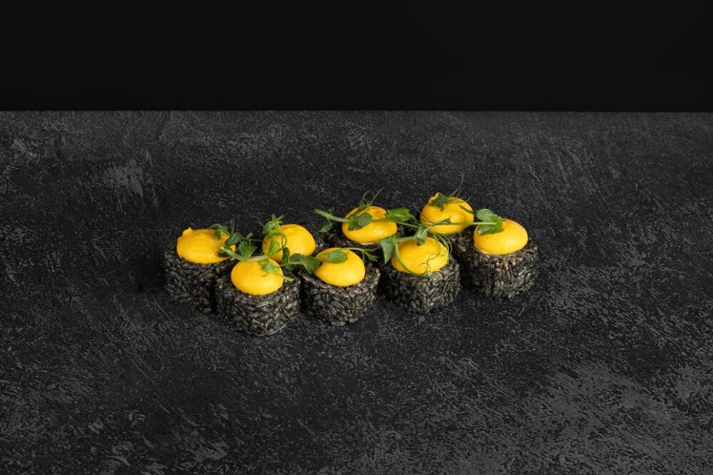 Состав: Рис черный, нори, краб (имитация), креветки, сыр творожный, сырный соус, микрозелень. В комплекте: имбирь-1 шт, васаби-1шт, соевый соус-1 шт.