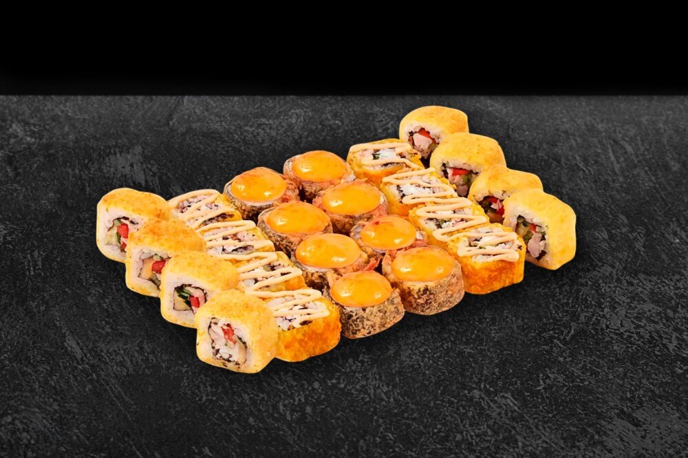Состав: калифорния темпура, цезарь темпурный, темпурный кани В комплект входит: Имбирь-2шт,Васаби-2шт,Соевый соус-2шт.