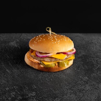Состав: Нежная булочка, мясная котлета, хрустящий салат, томаты, соус биг тейсти, сыр.