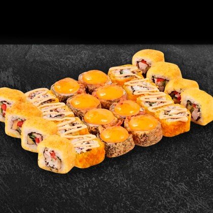 Состав: ролл Тай темпура, ролл Хот фиш, ролл Галактика , ролл Люкс с лососем, ролл классический с огурцом, ролл Запеченный с крабом. В комплекте:Имбирь-3 шт;Васаби-3 шт.;Соевый соус-3 шт.