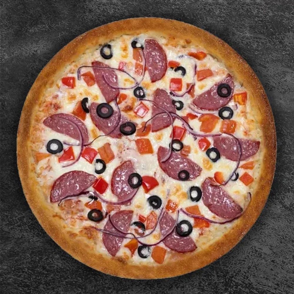 Состав: Тесто, соус томатный, сыр моцарелла, лук красный, томат, перец болгарский, сервелат, маслины.