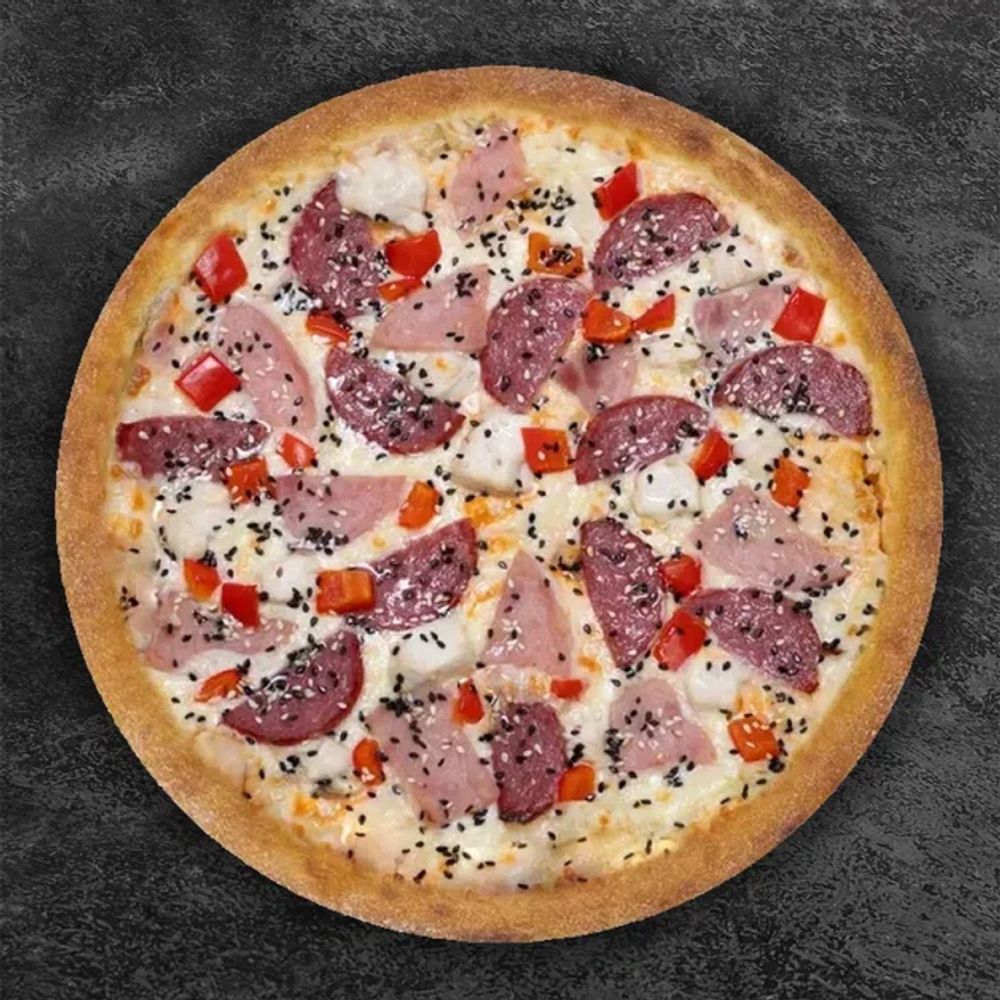 Состав: Тесто, бургерный соус, сыр моцарелла, ветчина, курица, перец болгарский, сервелат, кунжутный микс.