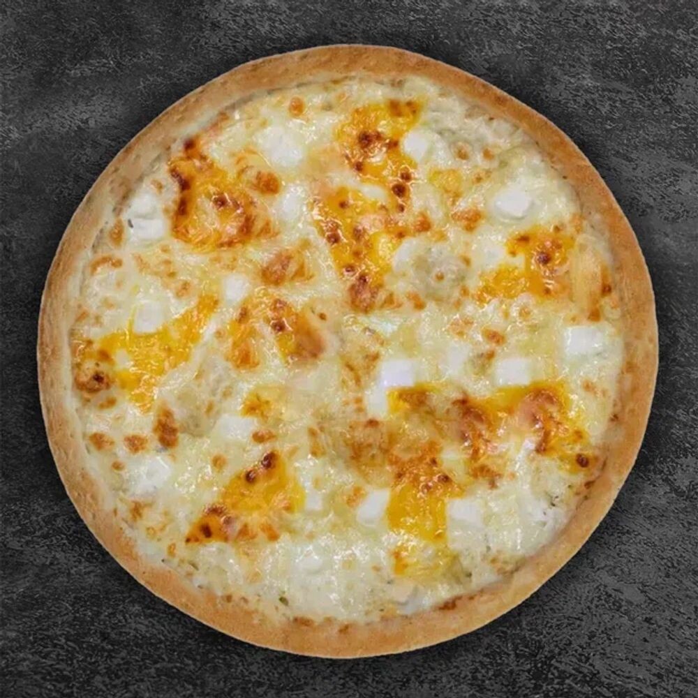 Состав: Тесто, соус цезарь, сыр моцарелла, сыр чеддер, сыр пармезан, сыр брынза.