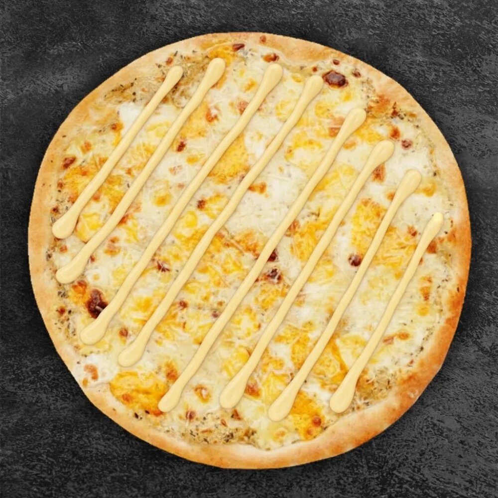 Состав: тесто, соус красный, сыр моцарелла, курица, сырный соус.