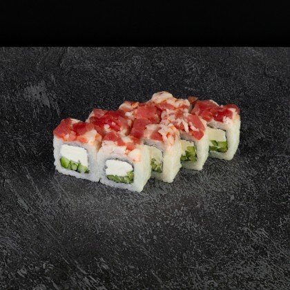 Состав: рис, нори, сыр творожный, томаго, креветки, спайси соус. В комплекте: имбирь-1 шт, васаби-1шт, соевый соус-1 шт.