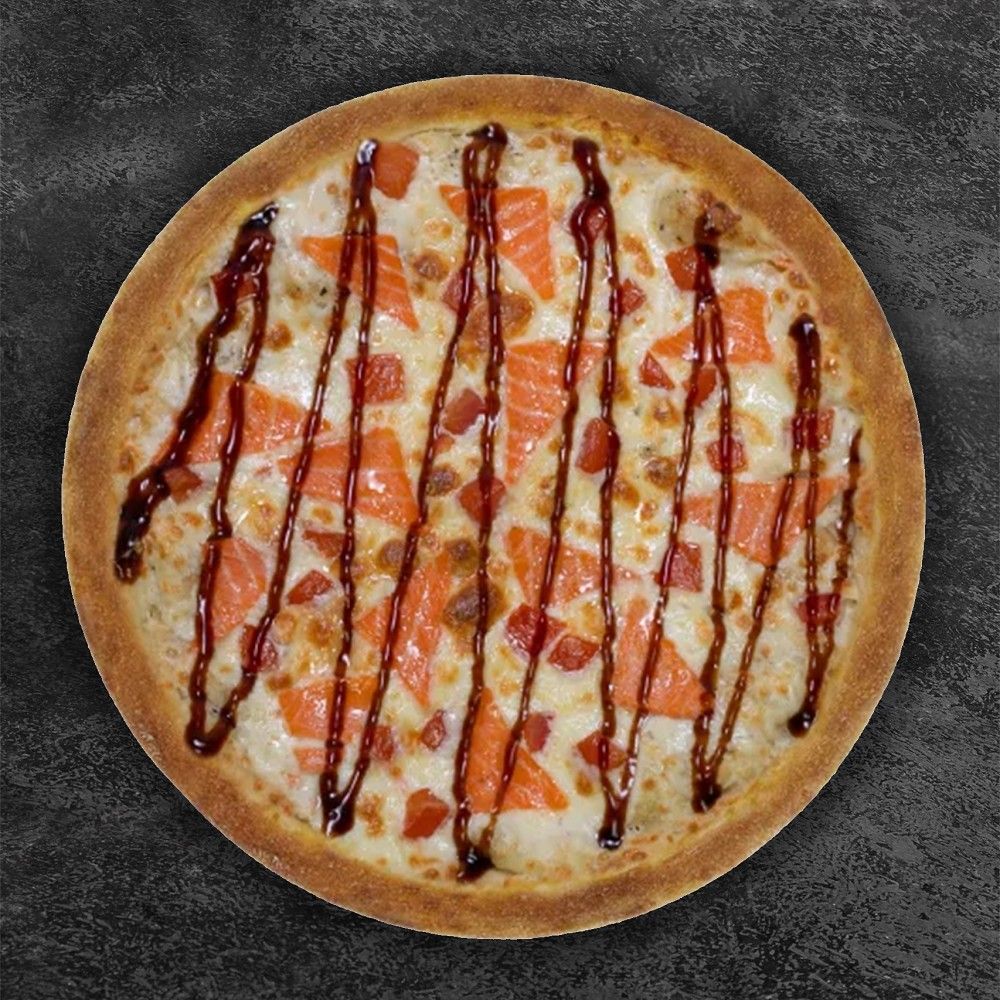 Состав: Тесто, соус сливочный, сыр моцарелла, лосось, томат, соус унаги.