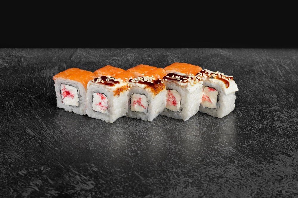 230 гр Состав: нори, рис, сыр, лосось, угорь, масаго, унаги, кунжут