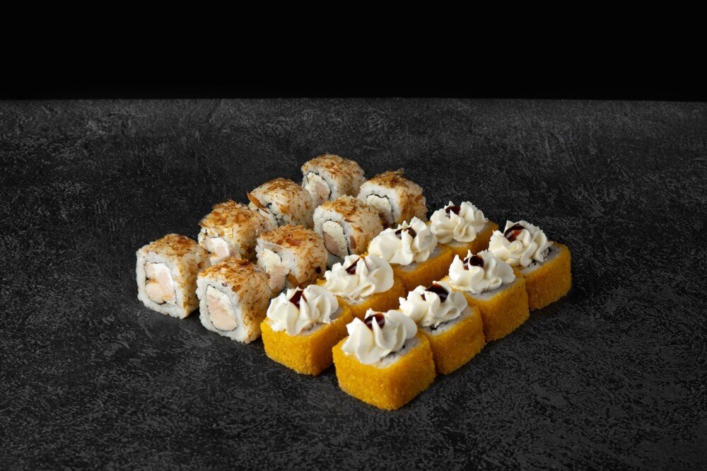 440гр 16шт Состав: Темпурный ролл Оазис, Ролл Бонито. В комплекте:Имбирь-1шт, Васаби-1шт,Соевый соус-1шт.