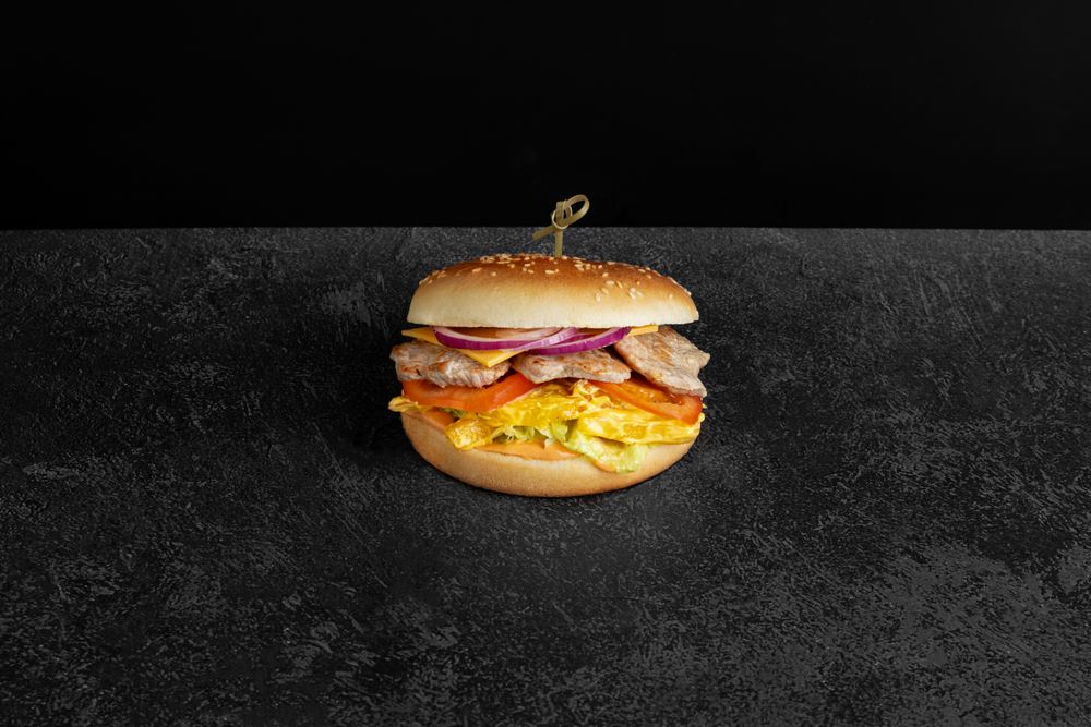 Состав: Нежная булочка, свинина жареная, сыр пластинками, томат, салат айсберг, лук красный, картофель фри, соус сырный, соус бургерный.