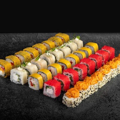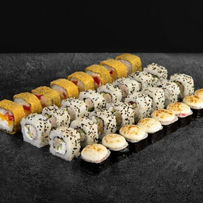 Состав: Темпурный Хил, Темпурный Каста, Пикантная креветка, Запеченный с курицей, Валет В комплекте: имбирь-3 шт, васаби-3 шт, соевый соус-3 шт.