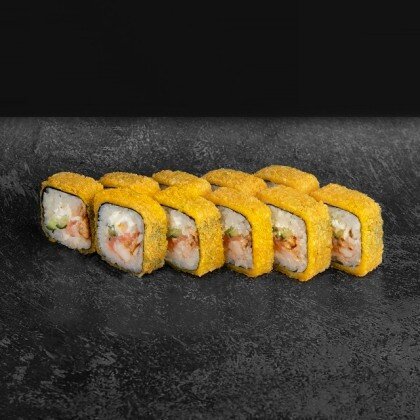 Состав: рис, нори, сыр творожный, угорь, лосось, имбирь, кунжут, огурец, соус спайси. В комплекте: имбирь-1 шт, васаби-1 шт, соевый соус-1 шт.