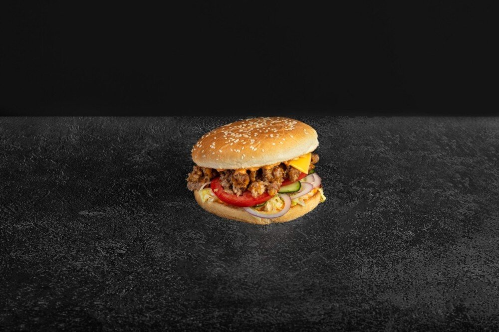 Состав: Нежная булочка, фарш говяжий, салат айсберг, лук красный, томат, огурец, соус бургерный, сыр пластинками, соус сырный, сыр чеддер.