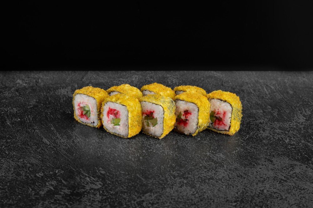 Состав: рис, нори, сыр творожный, креветка, огурец, имбирь, лосось. В комплекте: имбирь-1 шт, васаби-1шт, соевый соус-1 шт.