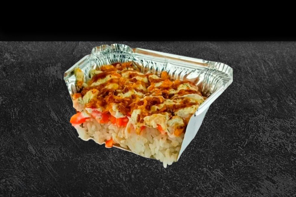 Состав: рис, курица, болгарский перец, чесночный соус, сыр моцарелла, соус унаги, лук фри.