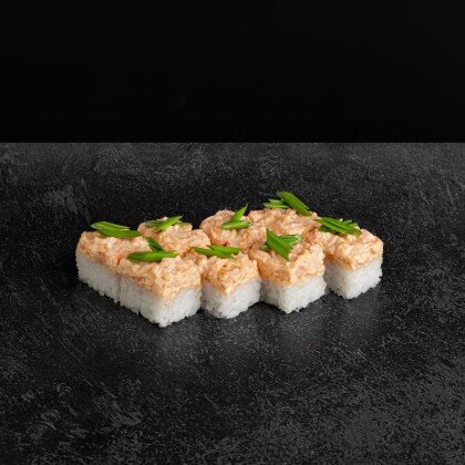 Состав: рис, нори, сыр творожный, икра масаго, огурец, лосось, соус спайси, микрозелень. В комплекте: имбирь-1 шт, васаби-1 шт, соевый соус-1 шт.