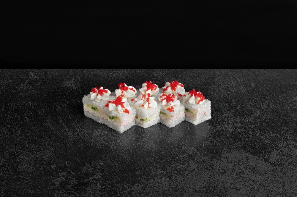 Состав: рис, нори, крабовый мусс, орурец, сыр творожный, икра масаго. В комплекте: имбирь-1 шт, васаби-1 шт, соевый соус-1 шт.