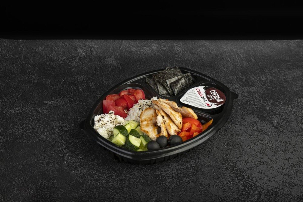 Состав: рис, нори, куриное филе обжаренное, томат, огурец, маслины, болгарский перец, сыр брынза, кунжут.
