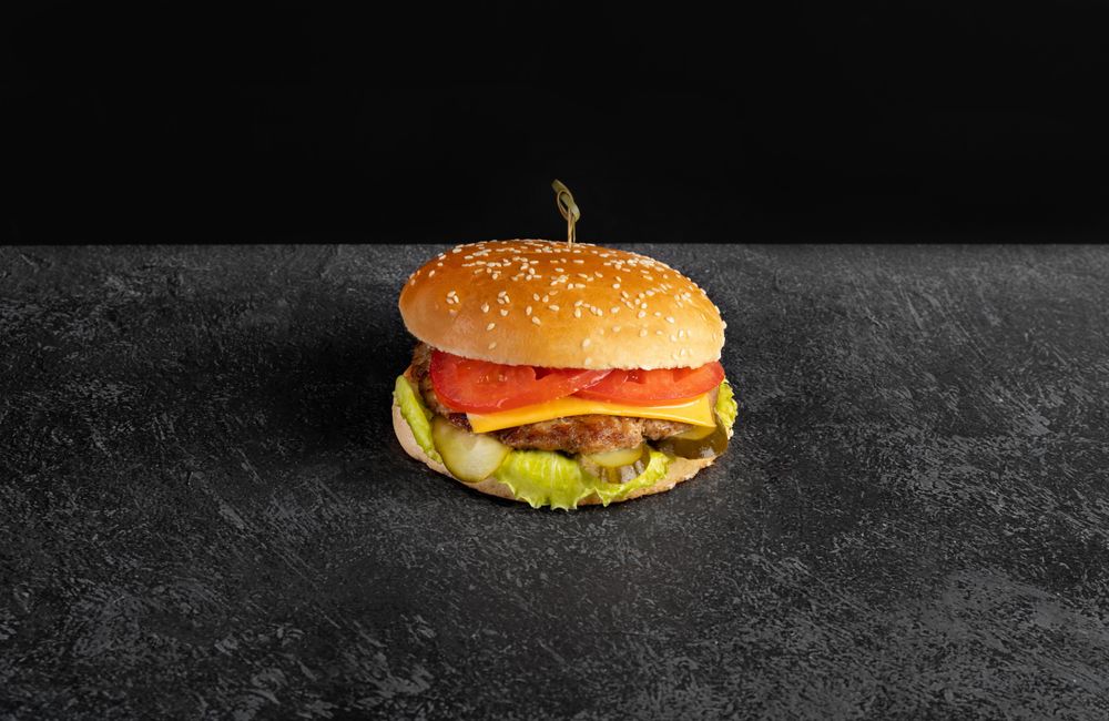 Состав: огурец соленый, сыр пластинка, котлета мясная, томат, пекинская капуста, соус.