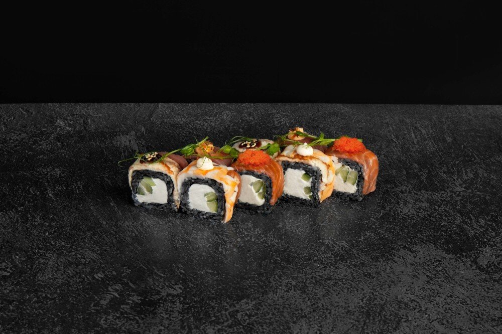 Состав: Рис черный, нори, сыр творожный, огурец, креветки, лосось, тунец, угорь, икра масаго, соус унаги, спайси соус, чесночный соус, микрозелень. В комплекте: имбирь-1 шт, васаби-1 шт, соевый соус-1 шт.