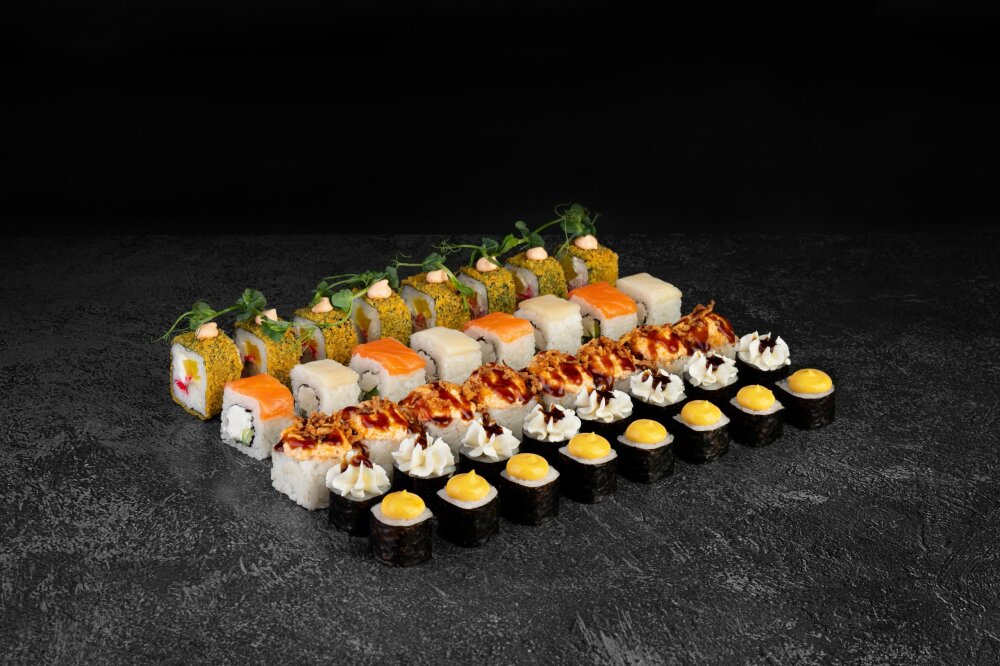 Состав: Ролл валет, Классический люкс с крабом, Классический люкс с огурцом, Запеченный драй, Темпурный край. В комплекте: имбирь-2 шт, васаби-2 шт, соевый соус-2 шт.