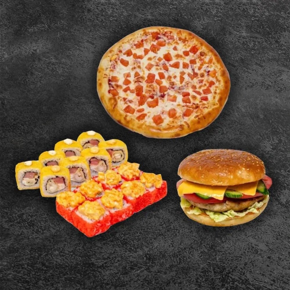 Сет Лакомый, пицца Маргарита, Чикен бургер. В комплекте: имбирь-1 шт, васаби-1шт, соевый соус-1 шт.