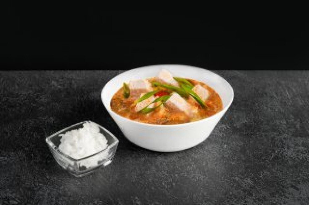 Состав: Бульон куриный, сливки, грибы шиитаке, томат, курица, рис, паста том-ям, соус шрирача, лук зеленый.