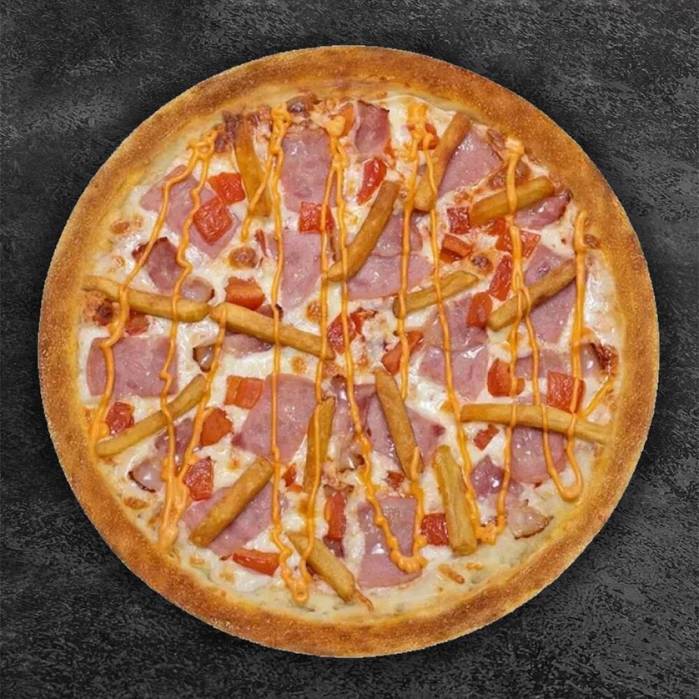 Состав: Тесто, соус сливочный, сыр моцарелла, ветчина, бекон, томат, картофель фри, соус бургерный.