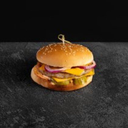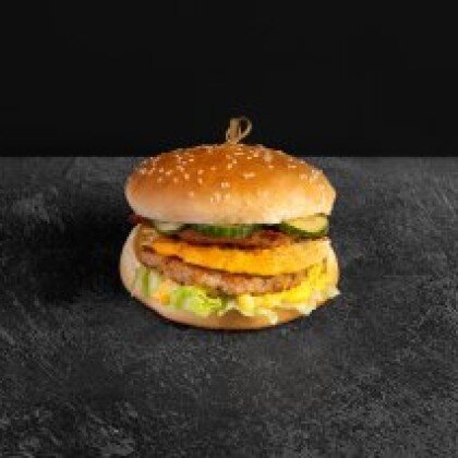 Состав: Нежная булочка, пекинка,фирменный соус, котлета, лук маринованный, бекон, огурцы соленые, чесночный соус, сыр.