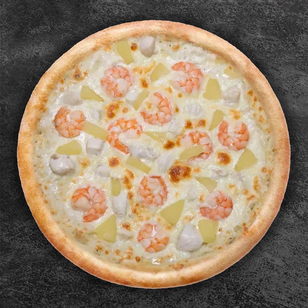 Состав: Тесто, соус сливочный, сыр моцарелла, креветки, курица, ананасы.