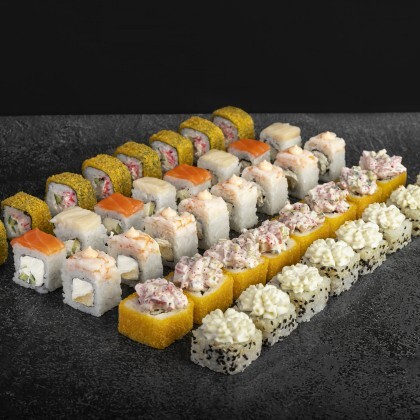 Состав: Темпурный 4 Сыра, Спутник, Цезарь, Калифорния, Запеченный тар-тар с креветками. В комплекте: имбирь-3 шт, васаби-3 шт, соевый соус-3 шт.