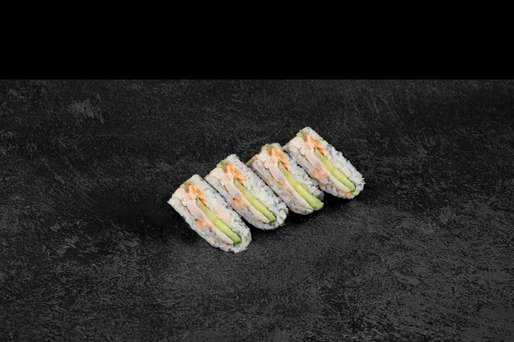 Состав: Рис, нори, огурец, курица х/к, соус спайси. В комплекте: имбирь-1 шт, васаби-1шт, соевый соус-1 шт.