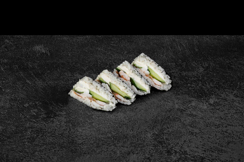 Состав: Рис, нори, сыр творожный, креветки, огурец. В комплекте: имбирь-1 шт, васаби-1шт, соевый соус-1 шт.