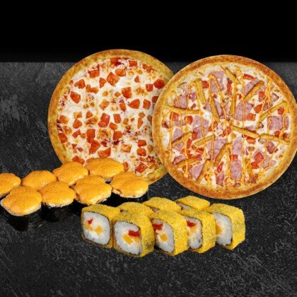 Состав: Пицца Цезарь, Сет Легкий. В комплекте: имбирь - 2 шт., васаби - 2 шт., соевый соус - 2 шт.