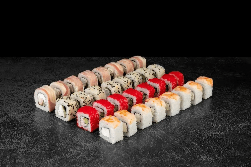 Состав: Калифорния с крабом, Мясной, Таити, Сливочный чикен. В комплекте: имбирь-2 шт, васаби-2 шт, соевый соус-2 шт.