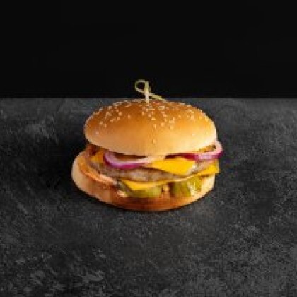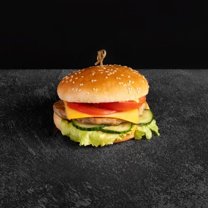 Состав: Нежная булочка, фарш говяжий, салат айсберг, лук красный, томат, огурец, соус бургерный, сыр пластинками, соус сырный, сыр чеддер.