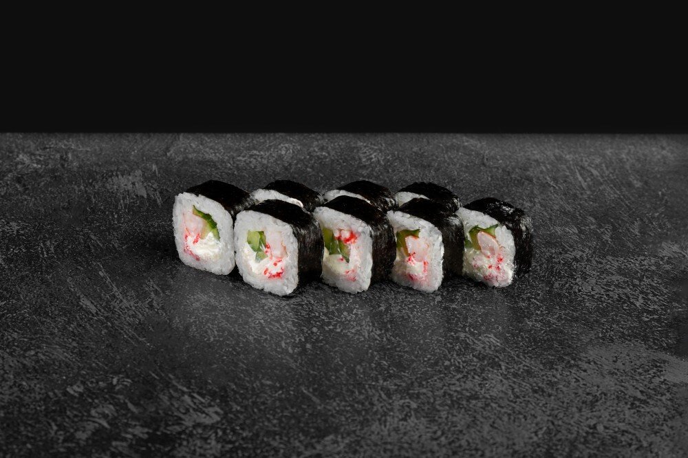 Состав: рис, нори, сыр творожный, креветка, огурец, икра масаго. В комплекте: имбирь-1 шт, васаби-1шт, соевый соус-1 шт.