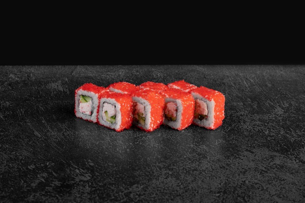 Состав: рис, нори, огурец, краб(имитация), икра масаго. В комплекте: имбирь-1 шт, васаби-1шт, соевый соус-1 шт.