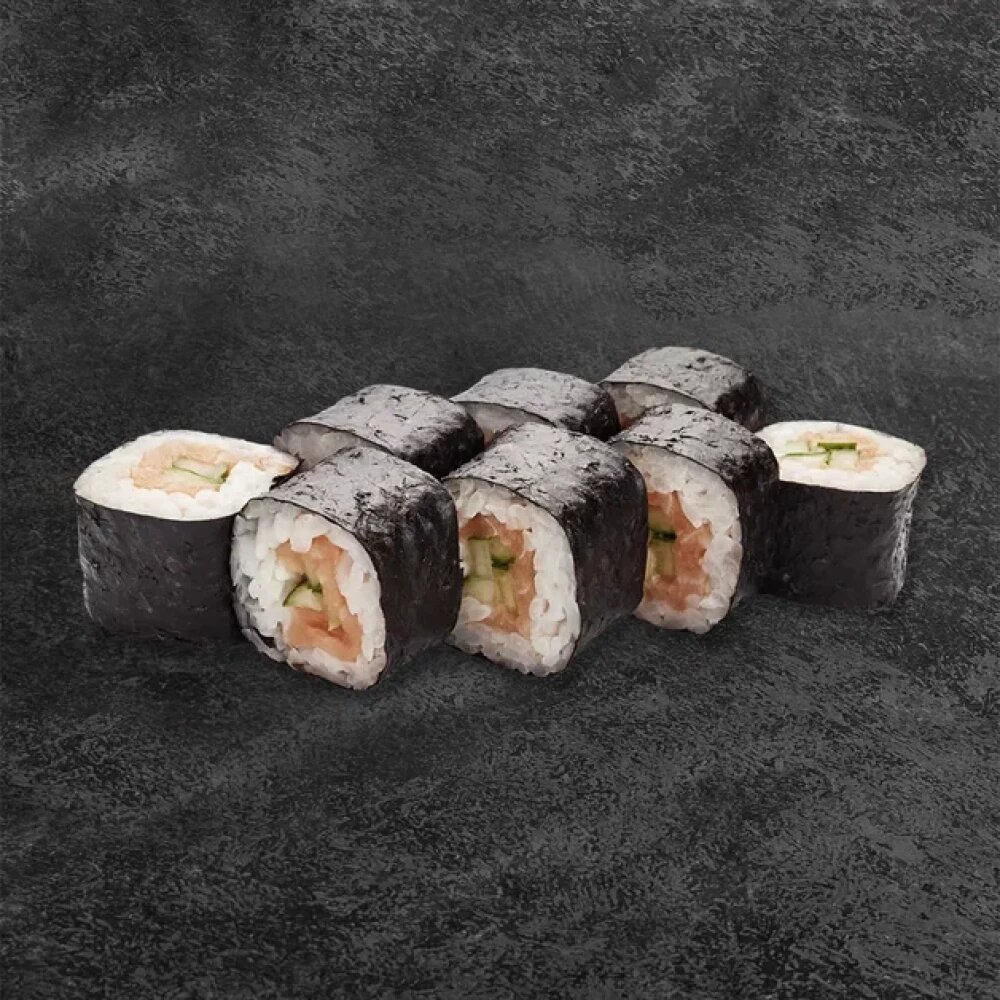 Состав: рис, нори, лосось, огурец. В комплекте: имбирь-1 шт, васаби-1шт, соевый соус-1 шт.