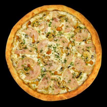 Состав: Тесто, соус томатный, сыр моцарелла, курица, бекон, колбаса пепперони, перец халапенью, соус спайси.