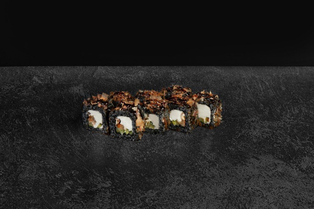 Состав: Рис черный, нори, угорь, огурец, сыр творожный , стружка тунца, соус унаги. В комплекте: имбирь-1 шт, васаби-1шт, соевый соус-1 шт.