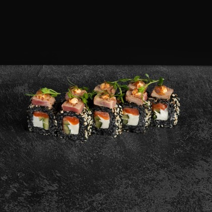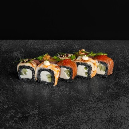 Состав: Рис черный, нори, краб (имитация),лосось, огурец, кунжут. В комплекте: имбирь-1 шт, васаби-1шт, соевый соус-1 шт.